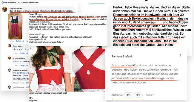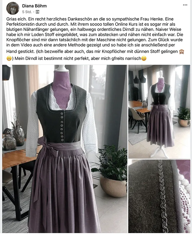 "Meine Tochter wird sich irrsinnig freuen, wenn ich sie mit der Probe des Dirndls überraschen werde. Nochmals vielen, vielen Dank, Dir und deinem Team. War eine gute Entscheidung den Kurs bei dir abzuschliessen, hatte gleich ein gutes Bauchgefühl."